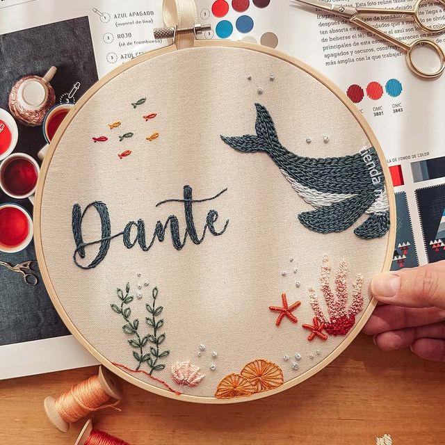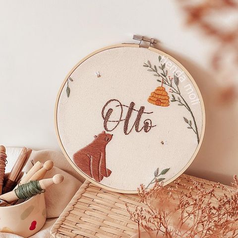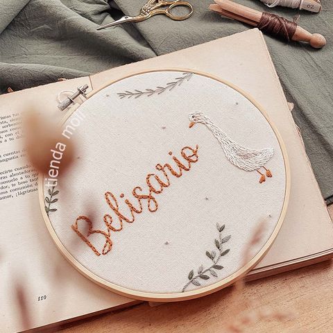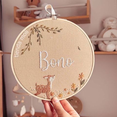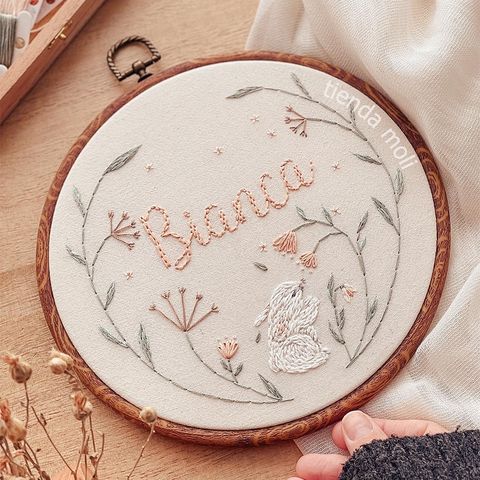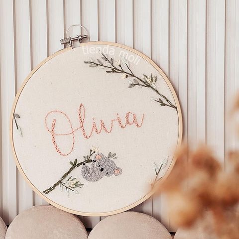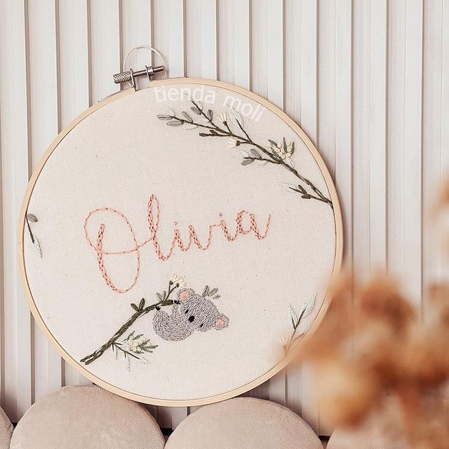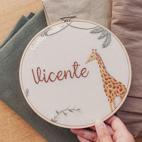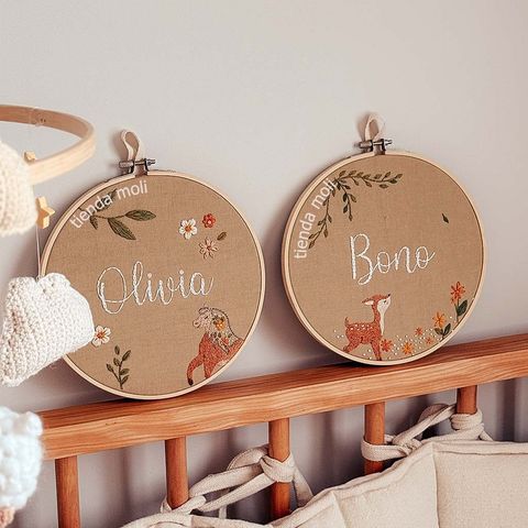 Un animalito especial para acompañar el nombre de tu bebé 💖. Nombre + animalito bordado en bastidor de 20 cm. Podés personalizarlo como vos quieras! Ver más detalles